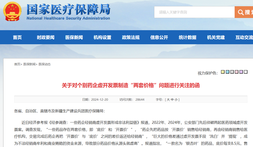 而在轻描淡写提及“价格进行调整”的背后,其实是一个影响很大的事件。2024年12月19日,《经济参考报》发布了《一些药企经销商虚开发票形成非法利益链》的调查报道,一款名为“银杏叶”的药品,底价每支8.5元,售价每支25.28元,医生每使用1支可提成4元;经测算,药品提成金额普遍占药品开票价与底价差额的两成以上。
