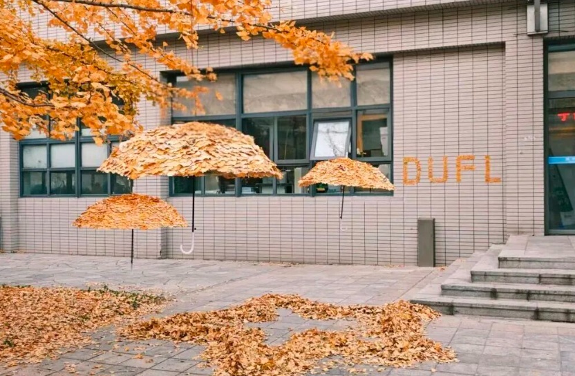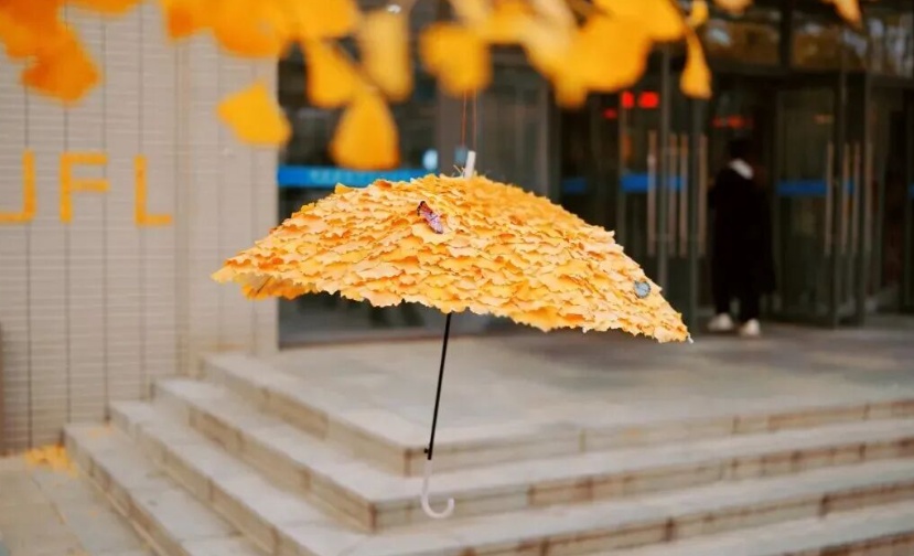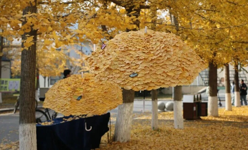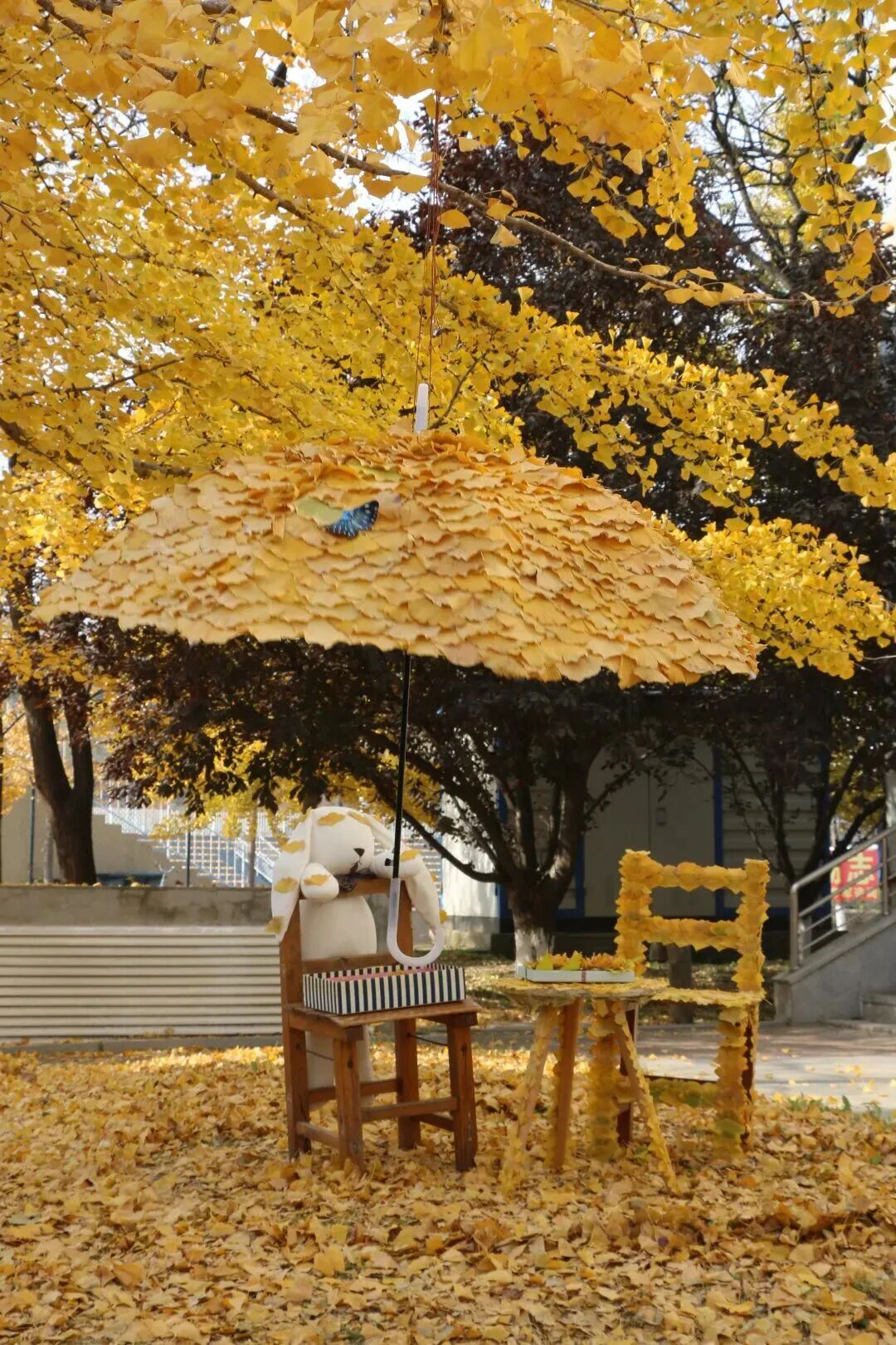 随后,金黄色的银杏叶被铺成了金色地毯、被装饰成灿烂灵动的银杏伞、还有别致的银杏桌椅……成为学生们的校园“打卡”点。
