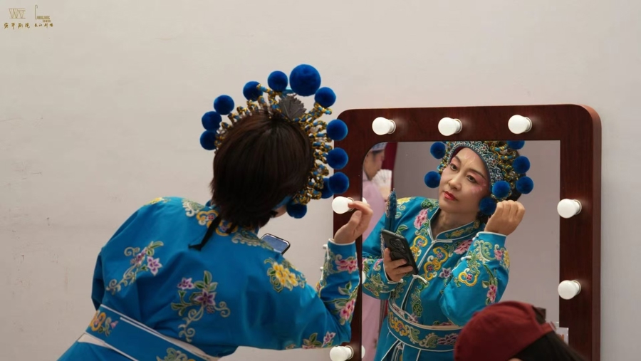 移步至三楼的戏曲妆造区,专业化妆师正为体验者勾勒眉眼、细描彩绘,一旁的衣架上挂满绣工精湛、纹样考究的戏服。陶女士身着戏服,在镜头前大方演唱了一段《梁山伯与祝英台》的选段,虽自谦“紧张没发挥好”,但眉眼神情已颇有韵味。一旁,带着孩子一同来体验的梁女士,正给摇身一变成“戏中人”的女儿拍照留念。“我们住在附近,经常来宛平看戏。这种体验活动很有意义,能让我们沉浸式了解中华文化的精粹。”