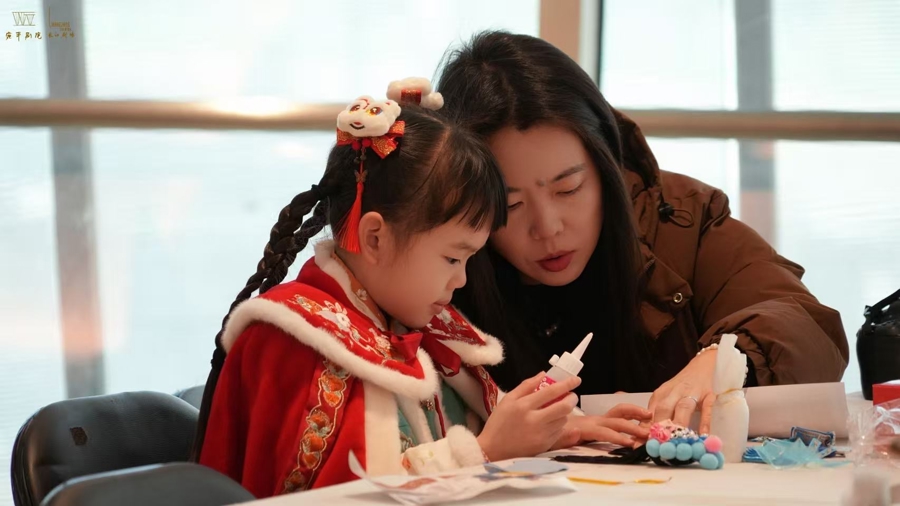 在身后的共享大厅,非遗手作活动正同步进行。参与者们在老师指导下,精心制作青蛇、白蛇戏曲绢人娃娃。“只留一个一字型的口子就好,这边给它剪开。”老师耐心讲解,“这是一个假领,后面要折双、打叉。”指尖流转间,精致的戏服被一点点复刻。与上午场的主角“青蛇、白蛇”相呼应,下午场则聚焦“平安骏锦”小马挂件,非遗技艺与辞旧迎新的美好寓意在此相融。