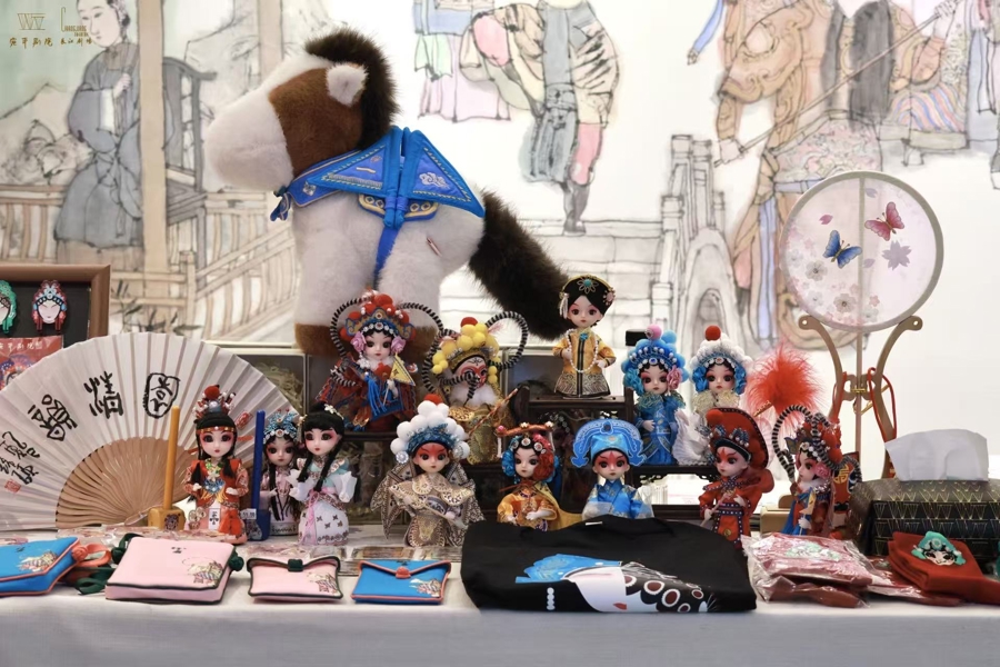 户外区域,弥漫着茶香的外摆车从早十点持续营业至下午四点半。遮阳伞下,座椅错落,一杯清茶、几缕暖阳,为热闹的嘉年华添上一笔闲适的注脚。剧院内的文创空间,陈列着以戏曲名马为原型设计的萌趣公仔“桃花花”“铁灰灰”“的卢神驹”,以及采用宋锦非遗工艺制作的“平安骏锦”挂件。一旁的休闲咖啡吧飘散着缕缕香气,观众可在此小憩,兑换打卡礼品。