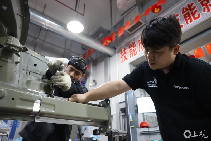 上师大附属杨浦现代职业学校车身修理集训基地,焦娇和师傅丁志鹏训练备战世赛选拔赛。他们“千锤百炼”力争上游。