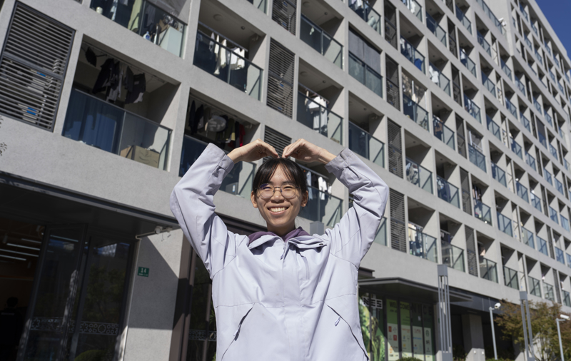 2025年11月13日,在上海的纳仕青年人才社区,南京大学计算机学院的同学在自己居住的“青年驿站”前留影。\n新华社记者 才扬 摄